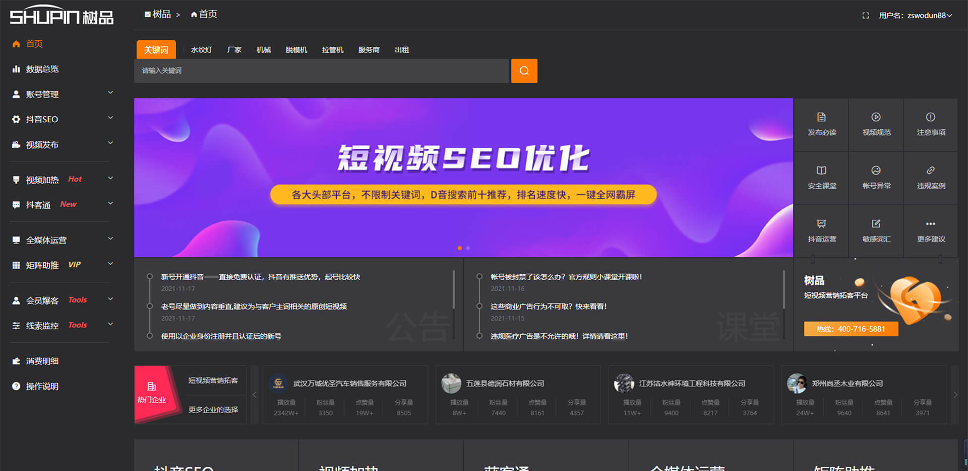 幫助企業(yè)解決在短視頻營(yíng)銷中的內(nèi)容生產(chǎn)、賬號(hào)搭建、賬號(hào)運(yùn)營(yíng) 、精準(zhǔn)低成本引流、業(yè)務(wù)場(chǎng)景、服務(wù)場(chǎng)景、服務(wù)效率等問(wèn)題的短視頻營(yíng)銷拓客平臺(tái)。